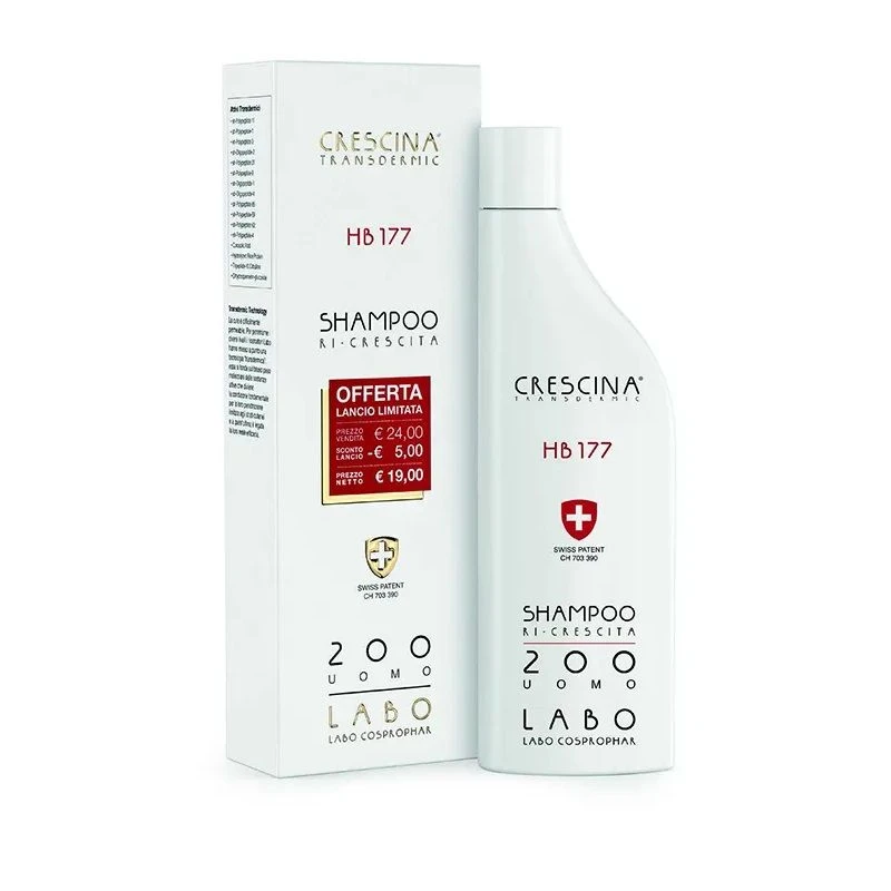 Lo Shampoo Crescina Ri-Crescita HB 177 è un detergente specifico per capelli radi a base dei principi attivi di Crescina Ri-Crescita HFSC (Brevetto Svizzero CH 703 390), dei complessi PLC12 (12 molecole Plate-Like), Bulge-Stem, Scalp Microbiome Complex e di 5 Enhancer.