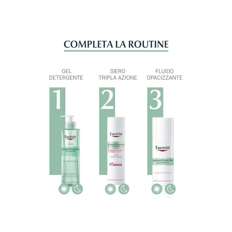 Eucerin DermoPurifyer Oil Control Gel Detergente senza sapone e senza profumo è un detergente viso non comedogenico per la detersione quotidiana del viso con pelle grassa, impura e tendente all’acne. Con il 6% di Anfo-Tensidi, deterge la pelle delicatamente ma in maniera efficace rimuovendo lo sporco, il trucco ed il sebo in eccesso. Grazie alle sue proprietà antibatteriche, il gel elimina i batteri della pelle e ne previene la proliferazione.