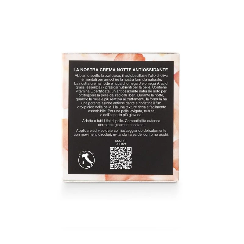 Abbiamo scelto la portulaca, il lactobacillus e l’olio di oliva fermentati per arricchire la nostra formula naturale. La nostra crema notte antiossidante è ricca di Omega 6 e Omega 9, acidi grassi essenziali – preziosi nutrienti per la pelle. Contiene vitamina E certificata, un antiossidante naturale noto per proteggere la pelle dai radicali liberi. Durante la notte, quando la pelle è più reattiva ai trattamenti, la formula ha una potente azione antiossidante e ripristina il film idrolipidico della pelle. Ha una texture ricca e facilmente assorbibile. Per una pelle levigata, nutrita e dall’aspetto più giovane.