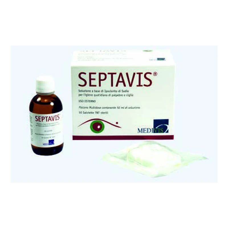 SEPTAVIS è una soluzione a base di Ipoclorito di sodio indicata per l’igiene quotidiana della zona perioculare (palpebre e ciglia). Septavis elimina delicatamente corpi estranei, residui oleosi ed eventuali depositi corpuscolati da palpebre e ciglia. Septavis grazie alla presenza di ipoclorito di sodio può essere impiegato per igienizzare piccole ferite, bruciature ed abrasioni della zona perioculare oltre che in tutti i casi di arrossamento del bordo palpebrale, di prurito, di calazi, di orzaioli, di traumi e di edema palpebrale causati da blefarite e/o congiuntiviti batteriche e virali.